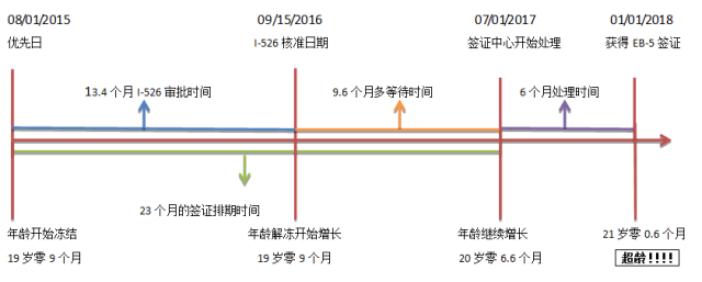 当范小西在提交I-526申请时,年龄开始冻结。但是一旦他的I-526申请被批准,年龄又开始增长了。因此到2018年1月1日获得EB-5签证前,范小西的年龄是19岁零9个月+9.6个月+6个月=21岁零0.6个月,超龄啦!!很遗憾,范小西由于超龄而被美国拒之门外。还有一条出路就是范小西跟爸妈要50万美元,自己作为主申请人自己申请,那么,爸妈再也不用担心他会超龄啦!2范小东的成功史范小西的堂弟范小东在申请I-526时的年龄是19岁零6个月。
