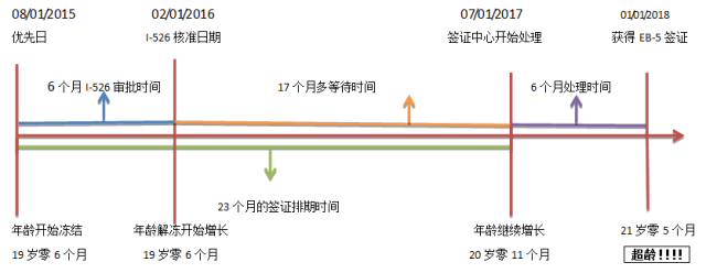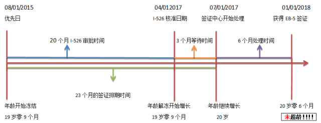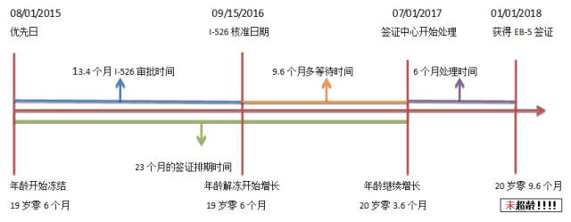 那么在范小东获得EB-5签证前,年龄是19岁零6个月+9.6个月+6个月=20岁零9.6个月(还未满21周岁!),也就是说范小东可以跟范先生一起移民美国啦!大家请注意请注意这些假设是有可能会变化的,因为13.4个月这个时间是移民局审批I-526的平均周期,也就是说,I-526的审核时间可以变短或者变长,从而多等待的时间可以变长或者变短,所以我们上述的分析也会随着I-526的审核时间或排期时间的变化而发生变化。下面,让我们再去看看范小北和范小南的故事。3范小北的血泪史范小东的堂妹范小北在I-526申请时也是19岁零6个月,但是她爸挑的EB-5项目中I-526审批仅用了6个月。