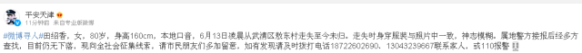 田绍香,女,80岁,身高160cm,本地口音,6月13日凌晨从武清区敖东村走失至今未归。走失时身穿服装与照片中一致,神志模糊。属地警方接报后经多方查找,目前仍无下落,现向全社会征集线索,请市民朋友们多加留意,如有发现请及时拨打电话18722602690、13043239667联系家人,或110报警[话筒