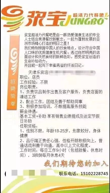 浆宝超活力代餐吧并非传统意义上的果汁店,我们是一家满足每日营养需求,提供美味健康的代餐饮品。浆宝代餐吧是由一群热爱健康生活的专业人士结合美澳餐饮新概念,积极推广健康新时代餐饮概念。根据中国人的饮食特点,研发出符合中国人口味的优质健康新鲜饮品。透过活泼明亮的门店设计和天然食材的新鲜色彩,希望您能感受浆宝的生命动感,并且和我们一起体验与品尝幸福洋溢的鲜活日记。