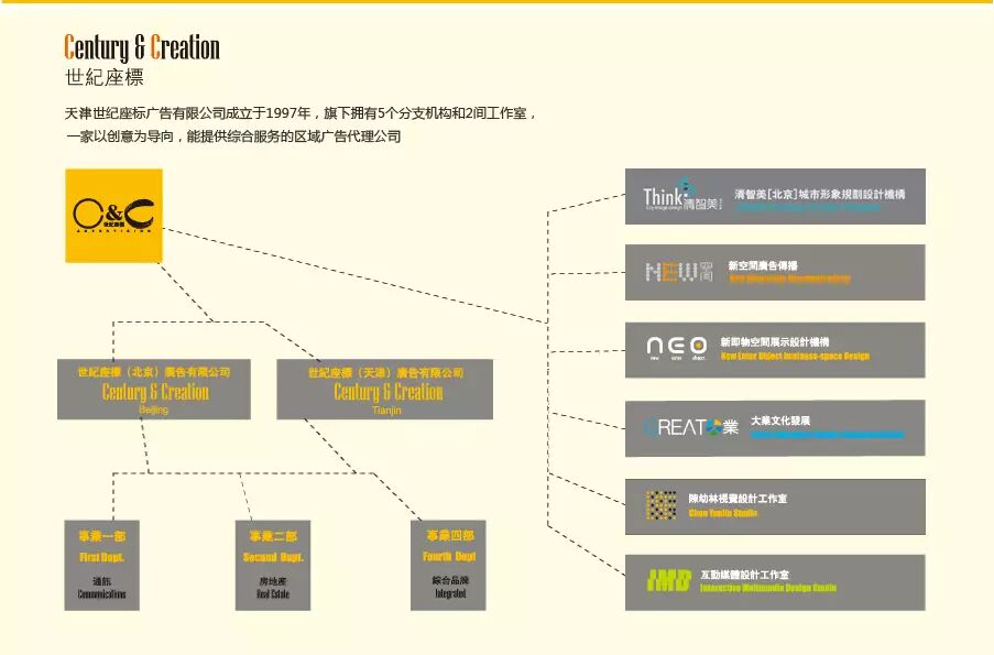 十余年来在通信、房地产、媒体形象包装及零售、金融保险、服装、食品等行业,先后服务数十个知名品牌,形成以世纪座标广告公司为龙头、涉及媒介购买、展示制作、城市形象设计等七家分支机构的集团化运作模式,成为最具竞争力的本土综合广告公司之一。