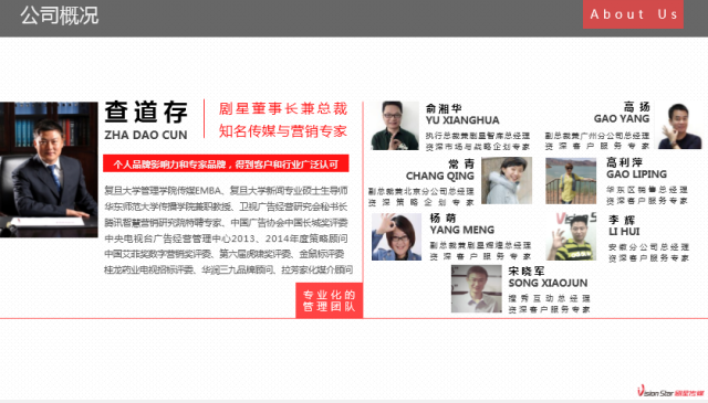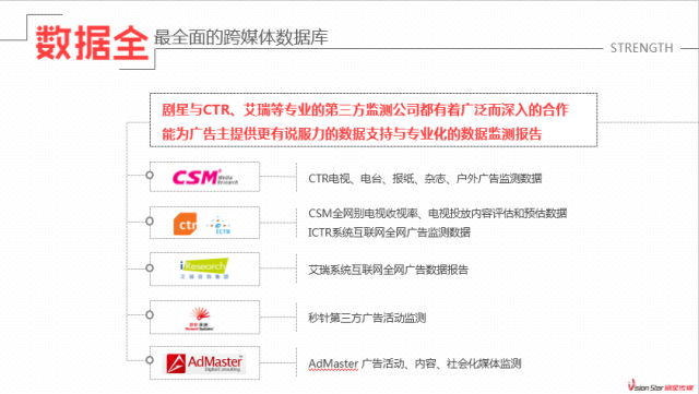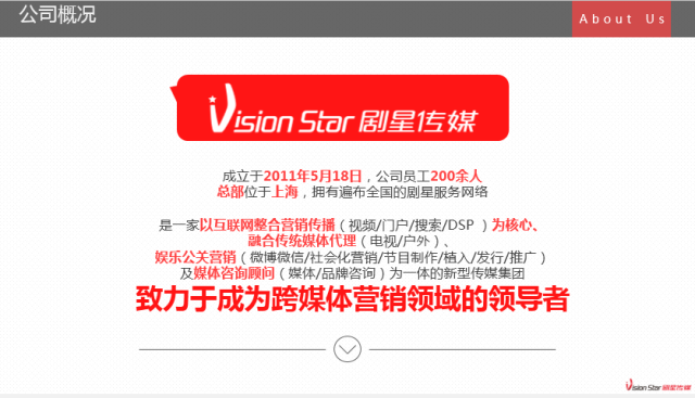 上海剧星传媒股份有限公司是一家以网络视频广告为核心,融合电视/搜索/门户/娱乐公关/媒体咨询顾问的全案代理公司,致力于成为跨媒体营销领域的领导者。