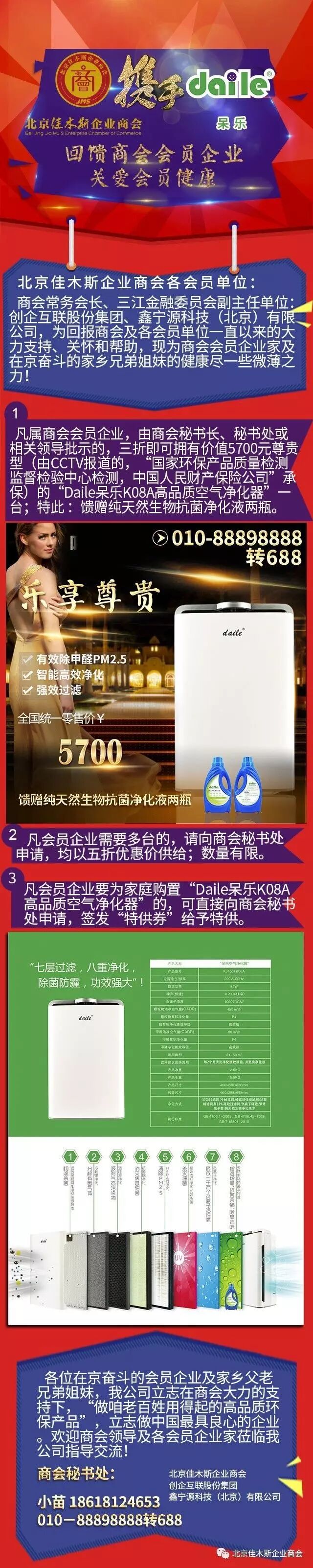 1、凡属商会会员企业,由商会秘书长、秘书处或相关领导批示的,三折即可拥有价值5700元尊贵型(由CCTV报道的,“国家环保产品质量检测监督检验中心检测,中国人民财产保险公司”承保)的“Daile呆乐K08A高品质空气净化器”一台;特此 :馈赠纯天然生物抗菌净化液两瓶。