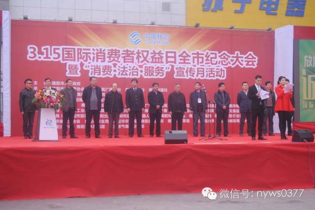 3月13-15日 “3·15国际消费者权益日全市纪念大会”在新华城市广场举行,活动第一天,全市“消费·法治·服务”宣传月活动同时启动。本次活动由南阳市人民政府主办,南阳市消费者协会、南阳人民广播电台、南阳电视台、南都晨报社承办。旨在推动广大企业、经营者树立依法、诚信经营、热情服务、积极回报社会的企业经营理念和作风,积极营造安全放心消费环境,促进我市经济快速稳定增长,助推全市经济转型发展、绿色崛起。