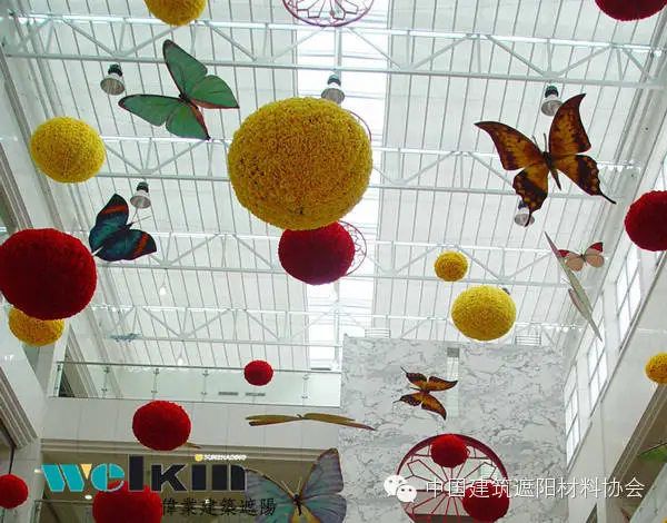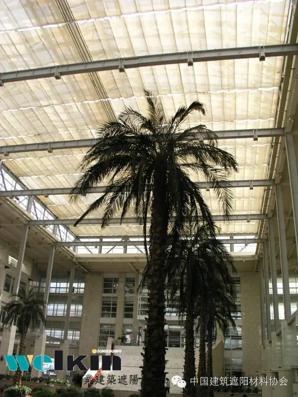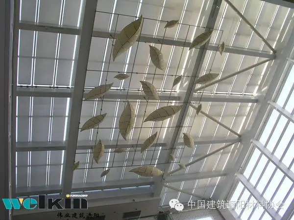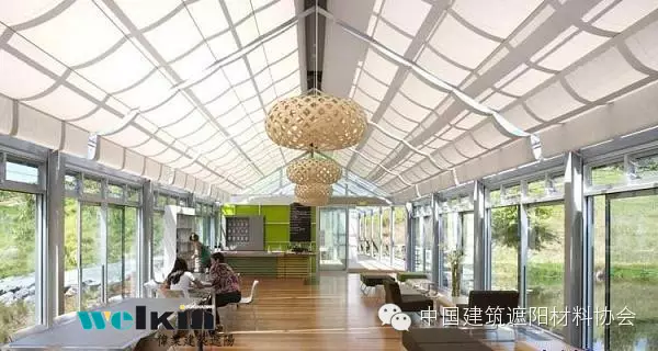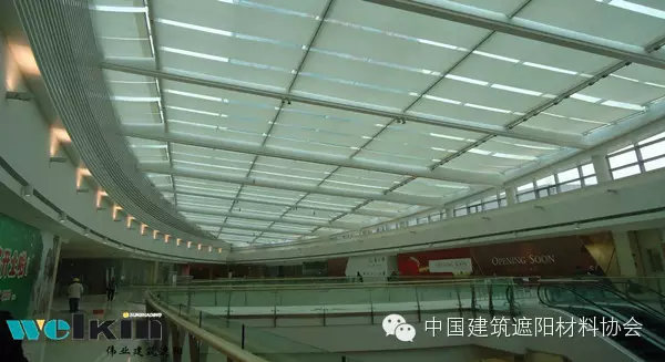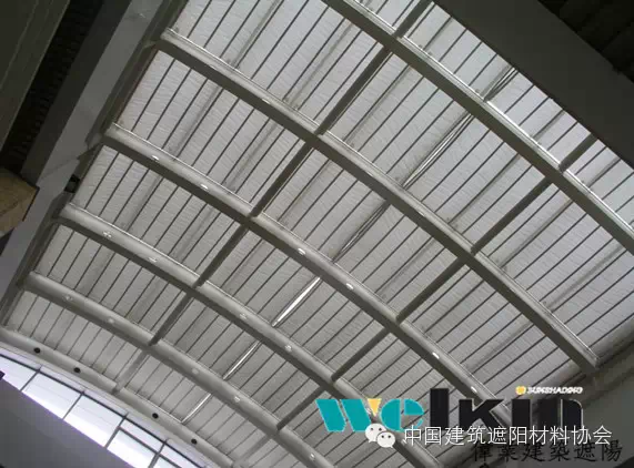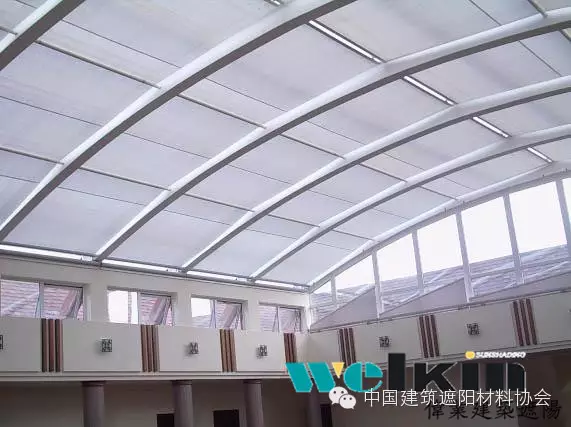 PTS天篷帘又称为折叠式天篷帘,不仅可以适用于水平平面玻璃天顶,而且通过轨道弯弧或其他技术处理,还可适应多种形状的玻璃幕墙结构。