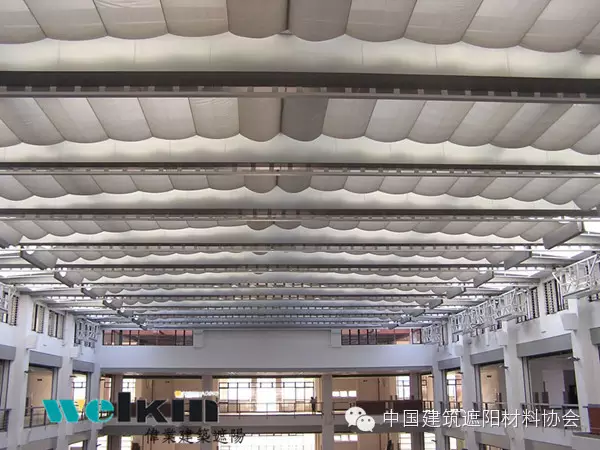 PSS 系统全称为“折叠式天棚帘”,从驱动方式角度分类,系统分为手动和电动两种方式,PSS 系统一般是固定在室内采光的顶部或斜侧面玻璃采光窗框上,是可以收放的遮阳系统,既双轨平动系统,可以根据室内的光线状况和外界天气情况实施收放。系统布置既可以是直线,也可以是弧形,通过我们专业的设计可以基本和建筑曲线相吻合,既遮阳实用又保持了原有的建筑设计风格,可谓一举多得。