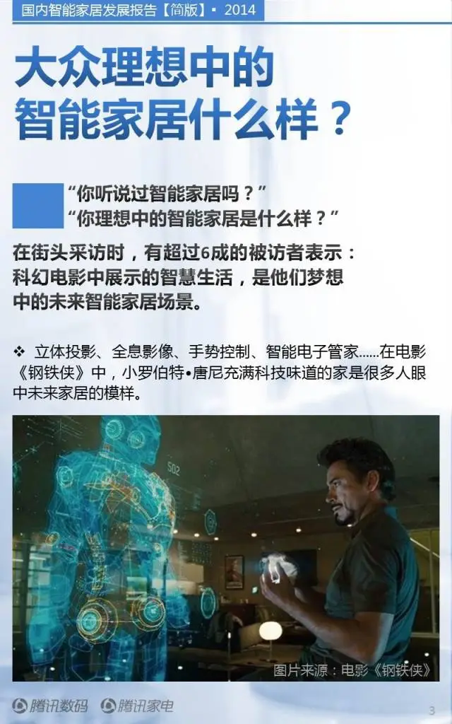 电影《钢铁侠》中,小罗伯特·唐尼的家充满了科技感,他可以双手在空中操作电脑,电脑呈现出来的全息影像直接显示在眼前,他的管家也是一部机器,他可以直接语音下达指令,甚至还能和机器管家聊天。每当看到类似画面,相信不少观众都会想,如果我家这样该多好,大家期望的这种生活就是智能家居。
