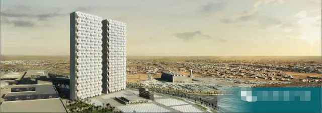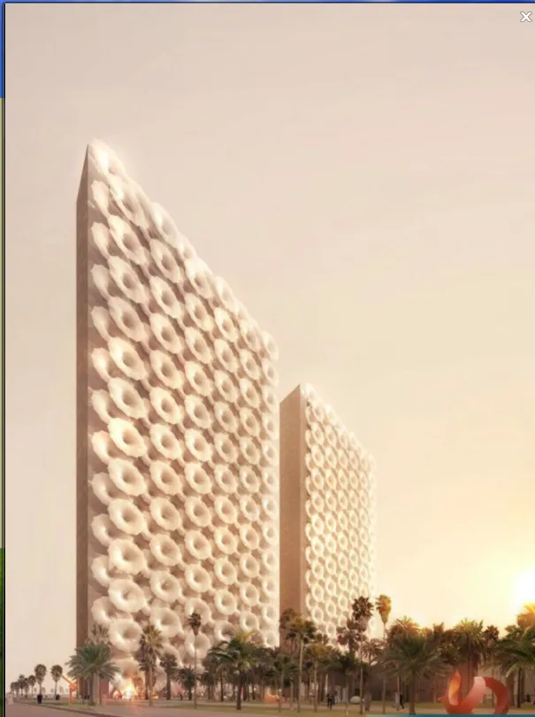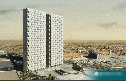 中东的两姐妹媒体公司总部大楼,建筑方案突显阿拉伯的传统风格。根据要求, 两座超薄设计的,外有石料包层的大楼就建成了。大楼的遮阳效果比较好,采用了一系列可伸缩的遮阳篷,应对中东地区的酷暑天气。这种外形的设计灵感来自阿拉伯的传统。