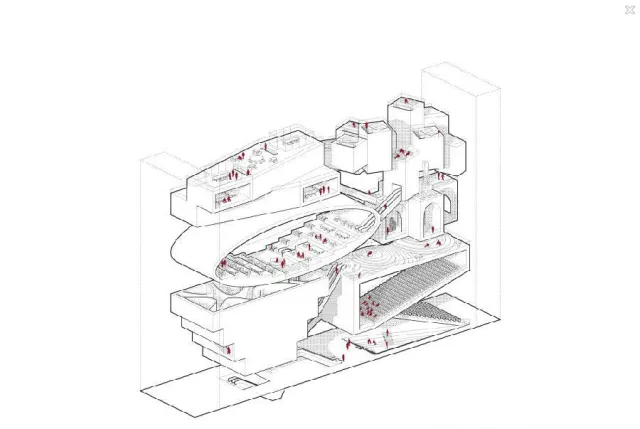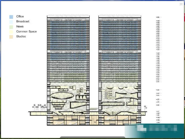 完工后,办公室将建在大楼的上半部分,在广播室和新闻工作室的上面。下半部分会修建会场、圆形剧场、礼堂、咖啡馆、食堂、员工休息室、行政室、美食餐厅、画廊、健身俱乐部、议会厅和剧院。